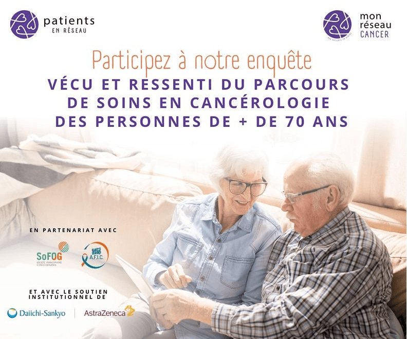 Cette enquête est organisée par l'association d'intérêt public Patients en réseau et sa plateforme Mon Réseau Cancer (www.monreseaucancer.org), en partenariat avec la Société Francophone d'Onco-gériatrie (SoFOG), l'Association Française des Infirmier(e)s de Cancérologie (AFIC) et avec le soutien institutionnel des laboratoires Daiichi Sankyo AstraZeneca.